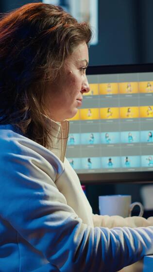 Vertical Photographer using software on computer to perform editing operations, enjoying cup of coffee while correcting images. Photo editor using PC to make adjustments to photographs in studio, camera A Pro Video