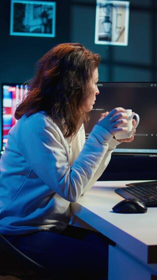 Vertical Portrait of engineer drinking coffee in the morning and futureproofing company network from downtimes. IT admin enjoying hot beverage while increasing data security, camera B Pro Video