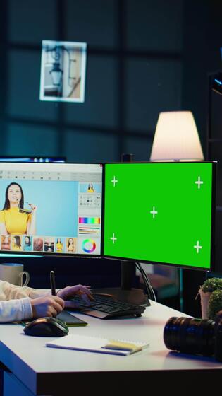 Vertical Photographer wearing headphones using advanced photo editing software on green screen monitor to upgrade images. Photo editor utilizing photographs retouching application on mockup PC, camera B Pro Video