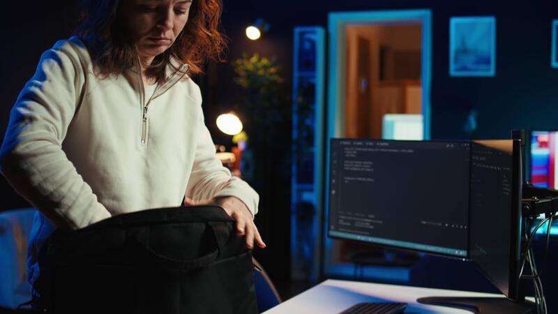 Teleworking programmer arriving in home office, ready to secure company servers from virus attacks by coding. IT employee starting job shift, building firewalls protecting data from threats, camera B Pro Video