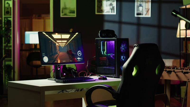 Stylish empty apartment with artwork on walls and computer screen left open at night showing videogame interface. Home living room with no people in and monitor left open Pro Video