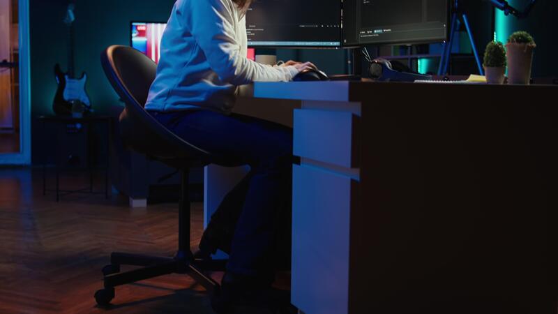 Programmer stretches body limbs after securing company servers from virus attacks all day. Fatigued IT remote employee relaxing tense muscles at desk after building firewalls protecting data, camera B Pro Video