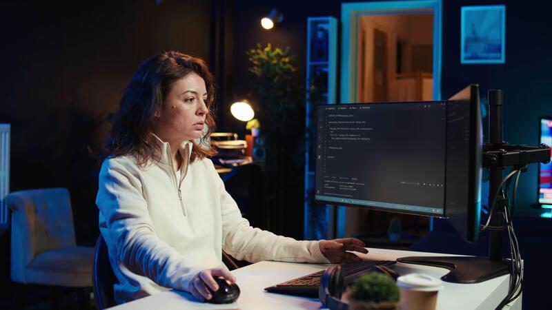 Cybersecurity specialist looking confused at computer screen while trying to fix broken code. Contemplative developer feeling worried and anxious about programming errors, camera B Pro Video
