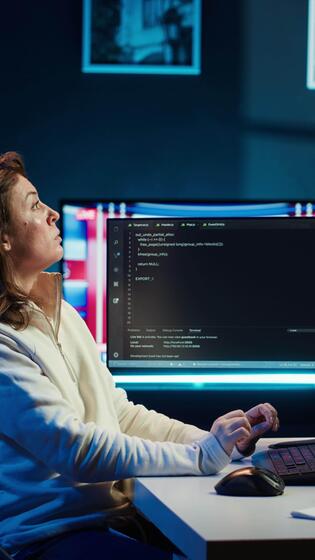 Vertical IT specialist working from home, testing and deploying programs using augmented reality. Programmer checking code on computer monitor and AR visualization, sitting at desk chair in apartment, camera A Pro Video