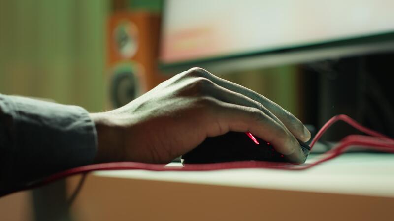 Gamer using keyboard and wired mouse to play videogames on desktop PC, close up shot. Man playing online game in front of monitor with computer peripherals at desk in apartment, camera A Pro Video