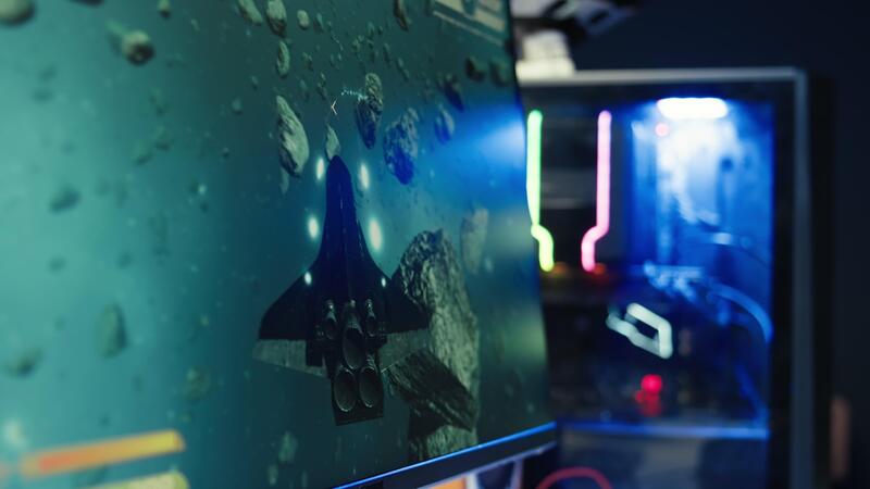 Player using keyboard and mouse to play videogame on gaming PC in neon lit apartment. Gamer using high tech computer peripherals to destroy enemies, relaxing at home, camera B close up Pro Video