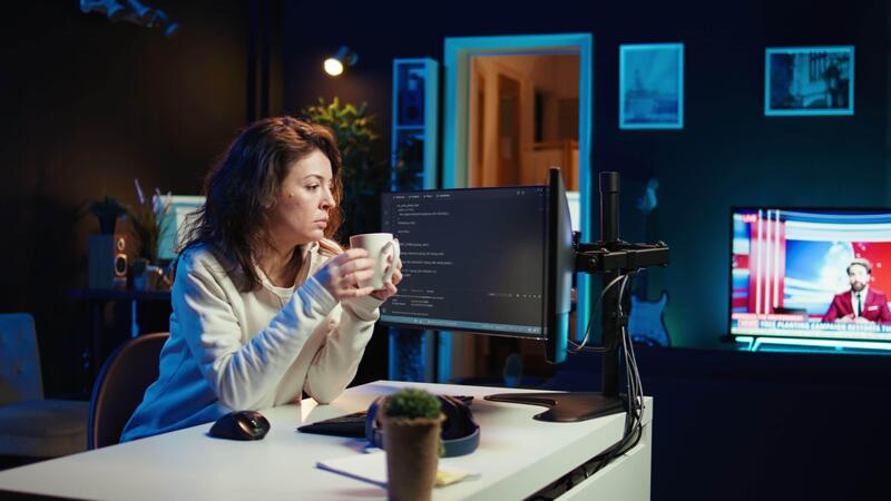 Portrait of happy computer engineer enjoying hot tea while implementing security measures to protect company systems and data. Joyful IT worker holding coffee mug and debugging code, camera B Pro Video