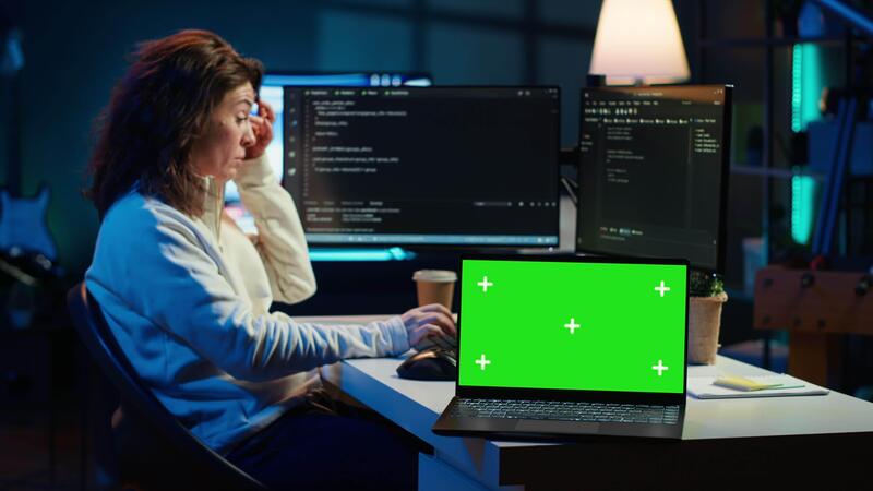 Admin using green screen laptop to implement security measures, protecting company systems and data. IT worker testing and debugging code for software applications on chroma key notebook, camera A Pro Video