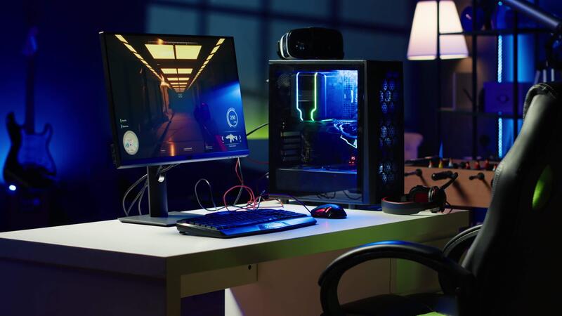Empty apartment living room with neon lights and gaming computer with first person shooter game left open on monitor. Singleplayer videogame on desktop pc display on desk late at night Pro Video