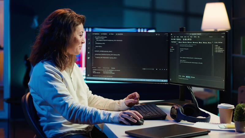 Happy developer celebrating after managing to secure company servers from virus attacks. Cheerful IT employee throwing fist in air from excitement after building firewalls protecting data, camera A Pro Video