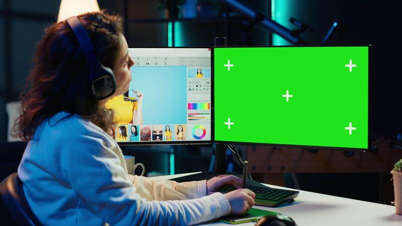 Photographer wearing headphones using advanced photo editing software on green screen monitor to upgrade images. Photo editor utilizing photographs retouching application on mockup PC, camera A Pro Video