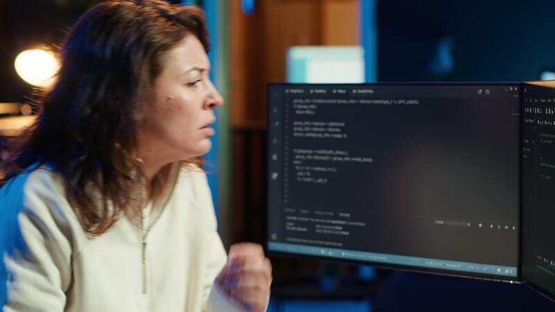 Worried cybersecurity expert pouting after finding many security vulnerabilities, scared of malware infections. Anxious developer distressed by cyber attacks on computer systems, camera A Pro Video