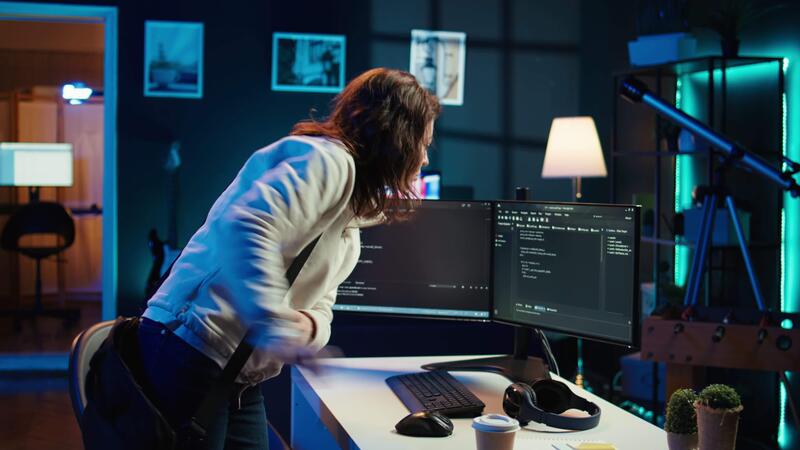 Computer scientist arriving in home office, ready to design and develop software applications. IT expert starting job shift, implementing and maintaining company systems, camera B Pro Video