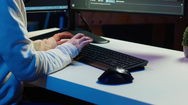 Teleworking computer technician typing on keyboard, implementing security measures to protect company systems and data, close up. Remote IT employee at home debugging code for software, camera A Pro Video