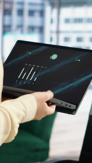 Vertical Woman CEO reviewing sales reports and market trends from analytics files, using data driven insights to adjust strategies and maximize business growth opportunities. Strategic thinking. Camera A. Pro Video