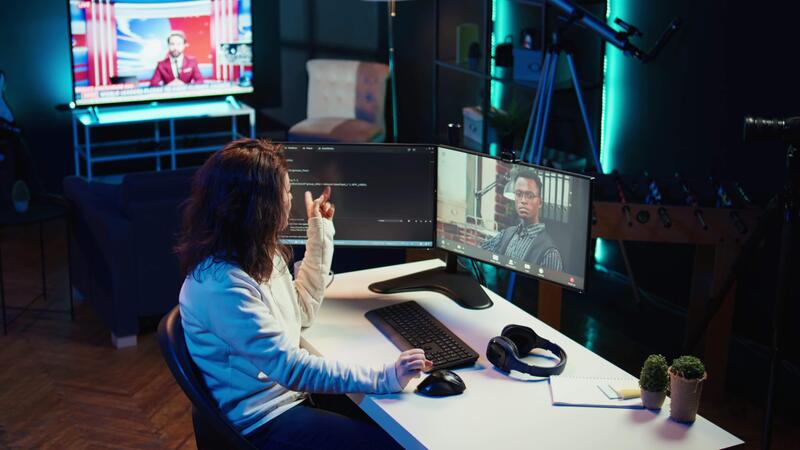 Software engineer teacher doing online tutoring, talking with student in online videocall about ways to do debugging. IT master teaching apprentice in webinar how to write code, camera B Pro Video