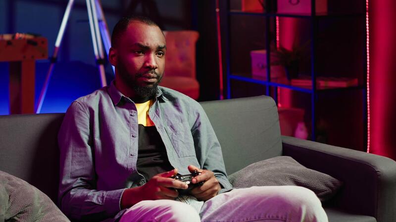 Focused gamer in RGB lit home gaming with gamepad, enjoying himself. Man sitting on sofa in neon illuminated living room, playing videogames on console using controller, camera A Pro Video