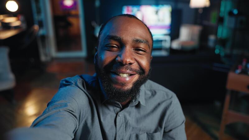 Point of view shot of content creator using smartphone to do live broadcast for subscribers, showing his home studio. Online star films himself for viewership using cellphone camera, POV perspective Pro Video