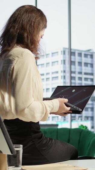 Vertical Woman CEO reviewing sales reports and market trends from analytics files, using data driven insights to adjust strategies and maximize business growth opportunities. Strategic thinking. Camera B. Pro Video