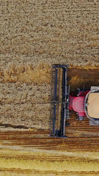 Aerial view on the combine working on the large wheat field. Harvesting machine working in the field Vertical Pro Video