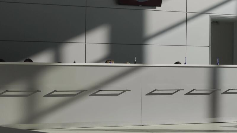 Minimalistic interior of a hotel lobby with the reception desk. HDR. Concept of architecture and design, grey reception desk and a wall with a minimum of details. Pro Video