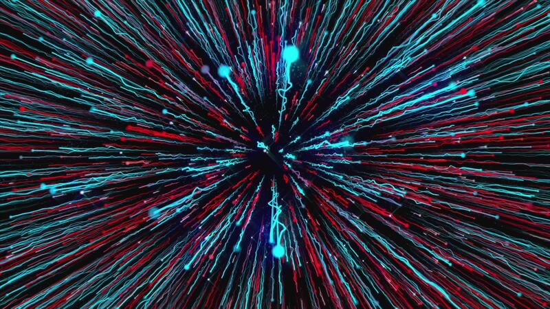Beautiful stream of glowing colorful rays on black background. Motion. Dive into cosmic hyper-jump with bright energy lines. Glowing colorful cosmic stream rays Pro Video