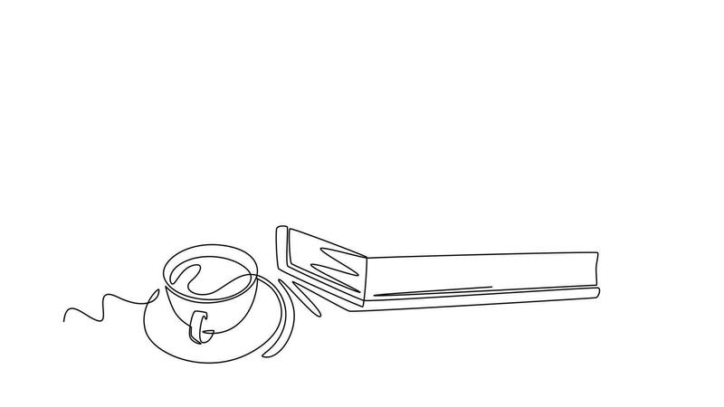 Self drawing animation of single line draw of opened page book with cup of hot black espresso coffee at college library. Book is a window to world concept. Continuous line draw. Full length animated Pro Video