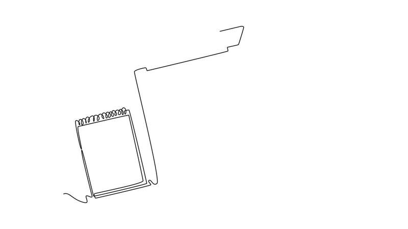 Self drawing animation of single line draw top view of computer laptop, smartphone, tablet and book cup of coffee at business office desk. Work space table. Continuous line draw. Full length animated Pro Video