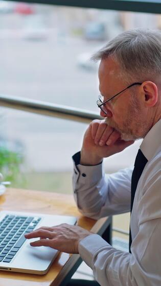 Senior businessman is working on computer in front of the window with city view. of working process in company. Vertical Pro Video
