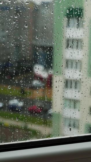 Rain drops on window glass in viewing cityscape. Drops of rain on a window pane with buildings background. Raining scenery on window. Vertical Free Video