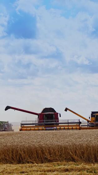 Red grain harvesting combine working in a sunny day. Yellow field with grain. Agricultural technic works in field. of working technic. Vertical Free Video
