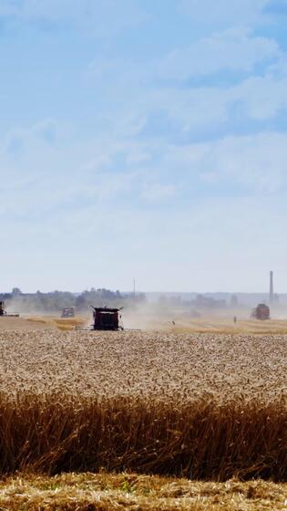 Grain harvesting combines working in a sunny day. Yellow field with grain on the front. Agricultural technic working in field. from the side. Vertical Free Video