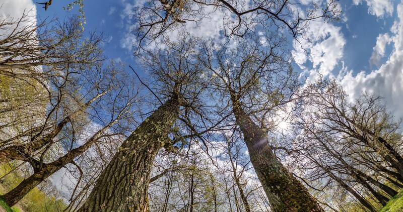 spinning and torsion and underneath tall forest with clumsy branches. Trees growing in the sky with loop rotate Pro Video