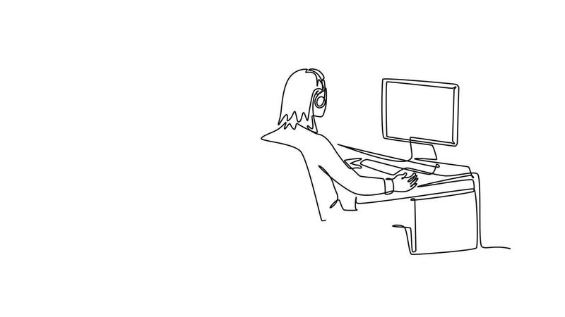 Animated self drawing of continuous line back view group of male female call center workers sitting in front of computer answer product order. Customer service business. Full length one line animation Pro Video