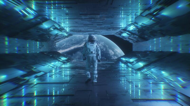 Astronaut Walking in Sci-Fi Neon Spaceship Tunnel with Planet Earth View Free Video