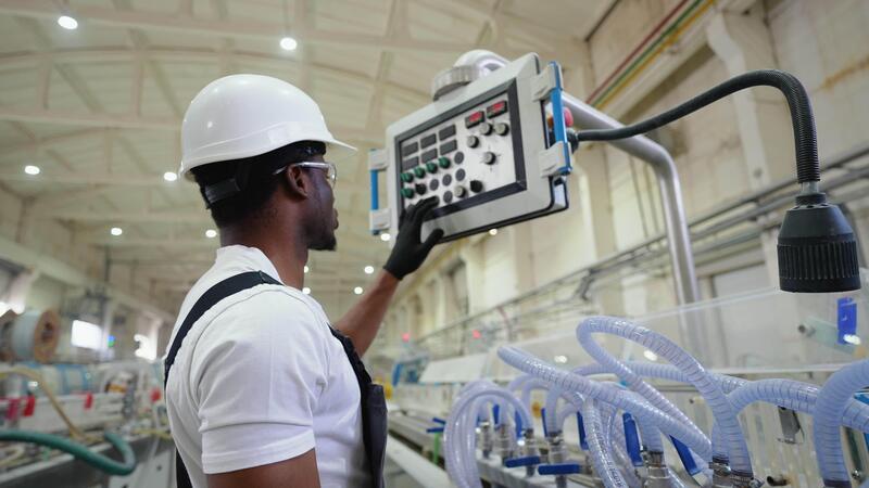 Black operator working at programmable CNC machine in factory industries Pro Video