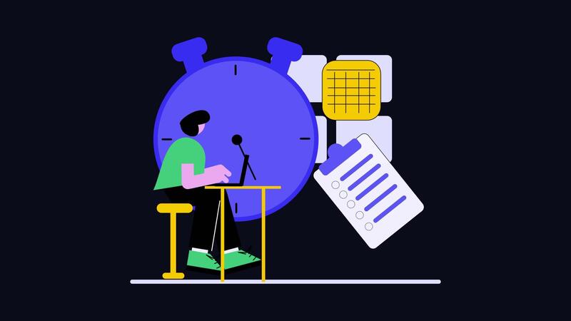 2d animation of people working in front of a laptop and there is a clock, calendar and task checklist, visualizing time management at work Free Video