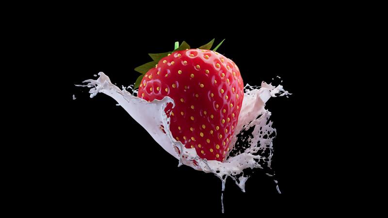 A looping rotation of strawberries in a splash of milk. Slow cyclic rotation and movement around strawberries and milk. File contains Alpha Channel. Pro Video