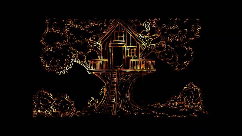 Neon frame effect, treehouse nestled high in a tree with a rope ladder and a small on black background Free Video