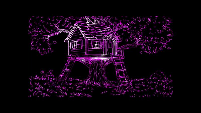 Neon frame effect, treehouse nestled high in a tree with a rope ladder and a small on black background Free Video