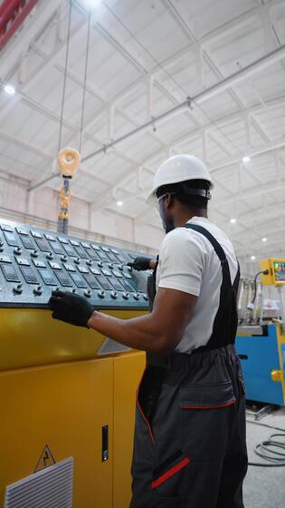 Black worker entering data in CNC machine at pvc window factory to get the production going. Vertical Pro Video