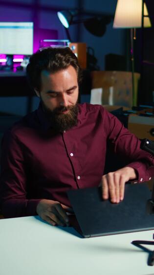 Vertical Tech expert assessing laptop performance, talking about components used inside, filming with smartphone. Entertainer reviewing notebook on technology internet channel, recording with phone, camera B Pro Video