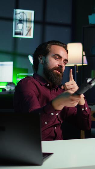 Vertical Influencer doing peace sign in front on cellphone attached to selfie stick in studio, chatting with viewers using mic. Man doing hand gesturing, using phone and microphone to record vlog, camera B Pro Video