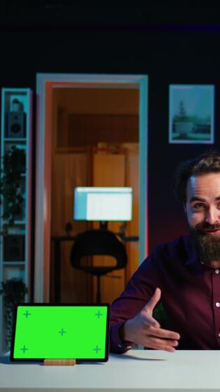 Vertical Tech engineer presenting green screen tablet in low budget price range, filming from dimly lit home studio. Content creator reviewing mockup digital device in front of online audience, camera B Pro Video