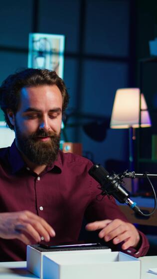 Vertical Tech guru assessing smartphone performance, feeling happy with high quality components used. Content creator shoots mobile phone review for online channel, recommending it, camera B Pro Video