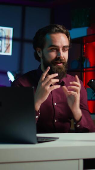 Vertical Happy media star using smartphone on tripod to film vlog channel intro for online streaming platforms. Joyful man greets viewers, presenting today topic, recording with mobile phone, camera B Pro Video