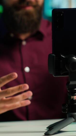 Vertical ASMR content creator using quality mic and cellphone on tripod to do anti stress , using whispering voice, close up. Man using professional microphone to induce sleepiness to viewers, camera A Pro Video