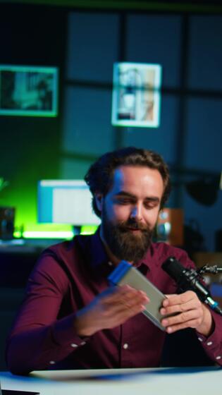 Vertical Man doing technology review of wireless portable speaker for internet vlogging channel. Music playing device held by content creator showing it to his subscribers, camera B Pro Video