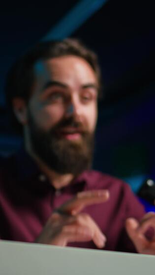 Vertical ASMR content creator using quality mic and cellphone on tripod to do anti stress , using whispering voice, close up. Man using professional microphone to induce sleepiness to viewers, camera B Pro Video