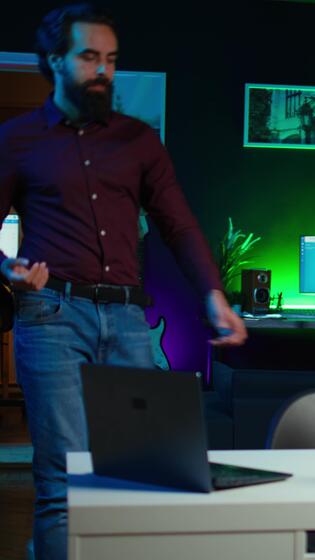Vertical Media star talks in front on cellphone attached to tripod and high quality mic in studio, discussing with viewers. Content creator using phone and professional gear to record social media Pro Video